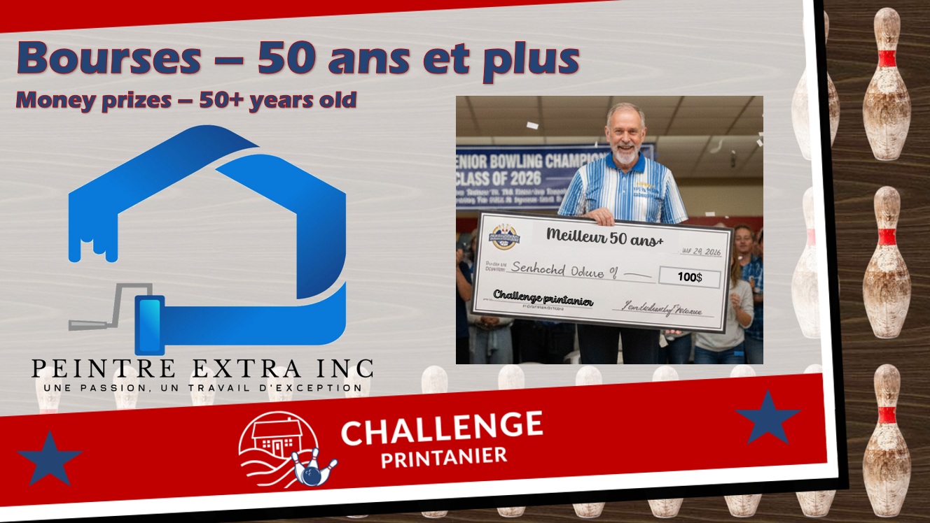 ***Bonne nouvelle pour les quilleurs âgés de 50 ans et plus : Peintre Extra Inc. présentera une bourse de 100$ au meilleur quilleur de cette catégorie pour chaque division aux termes des deux premières rondes. L’excédant de la commandite sera injecté dans les bourses aux équipes.